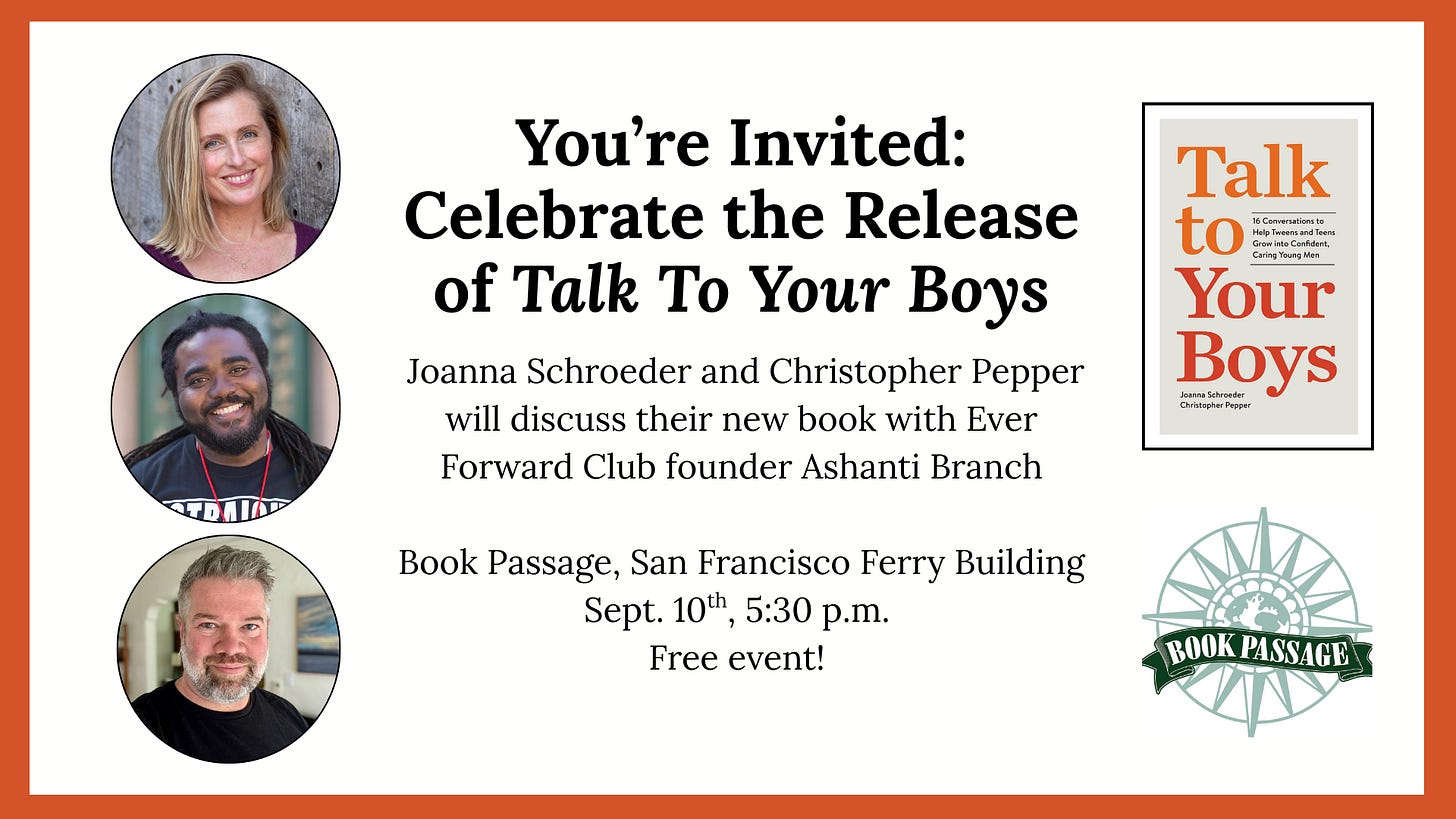 Hi Readers! The big news from me and is that our book Talk To Your Boys is out today. Get your copy at your favorite local bookstore, or order it from B&N, Bookshop.org, Amazon, Libro, or Audible.