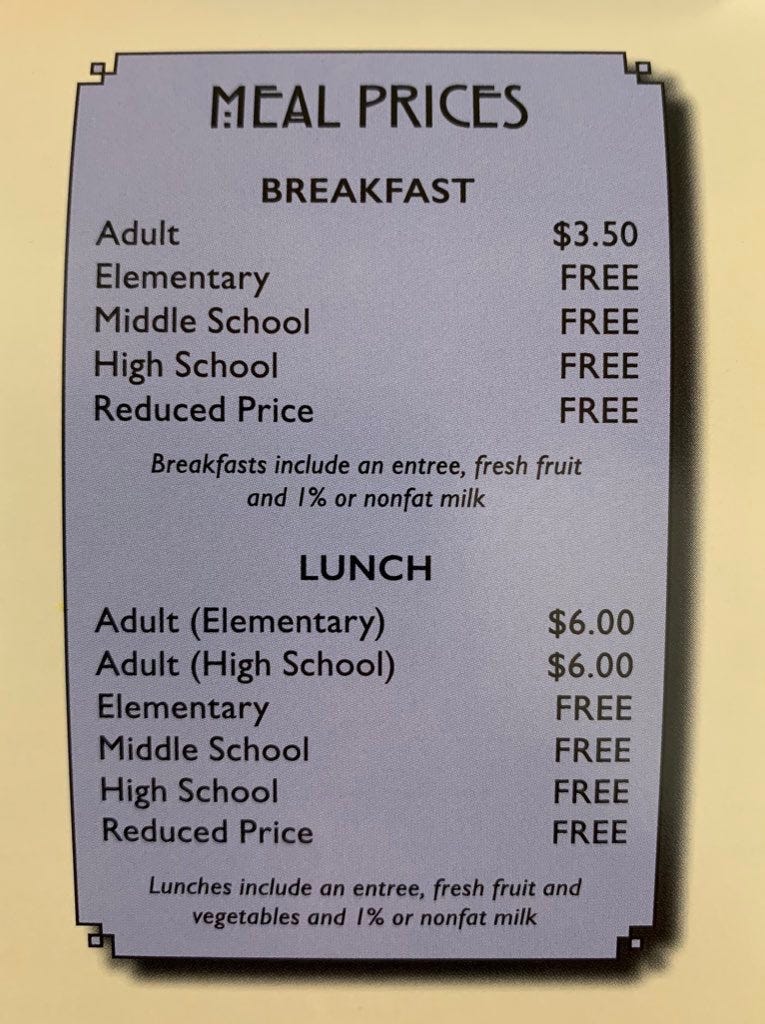 Those “FREE” prices reflect a change California implemented in the 2022-23 school year, making school meals free for every student. That’s a big deal, because California is huge, and its schools serve over 5.8 Million students every day. Since then, other states have passed similar policies, recognizing the benefits of universal school meals. I would like to see this change implemented across the country.